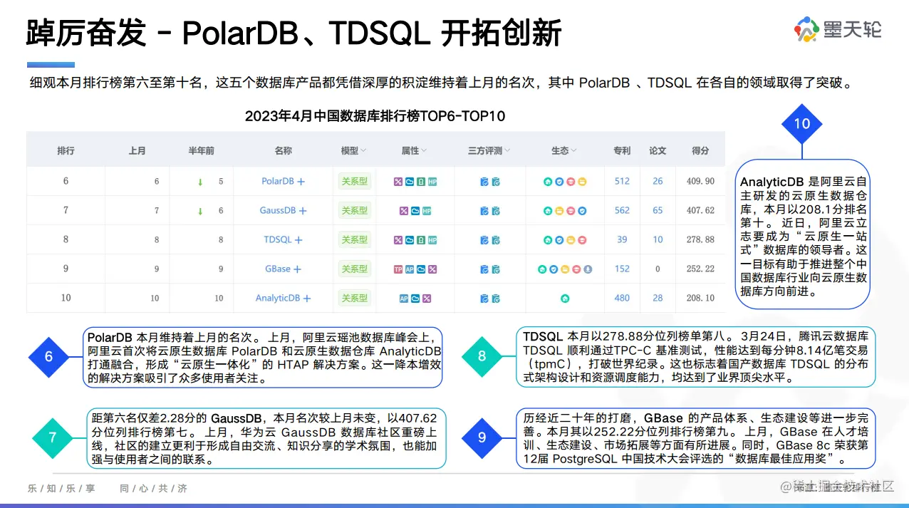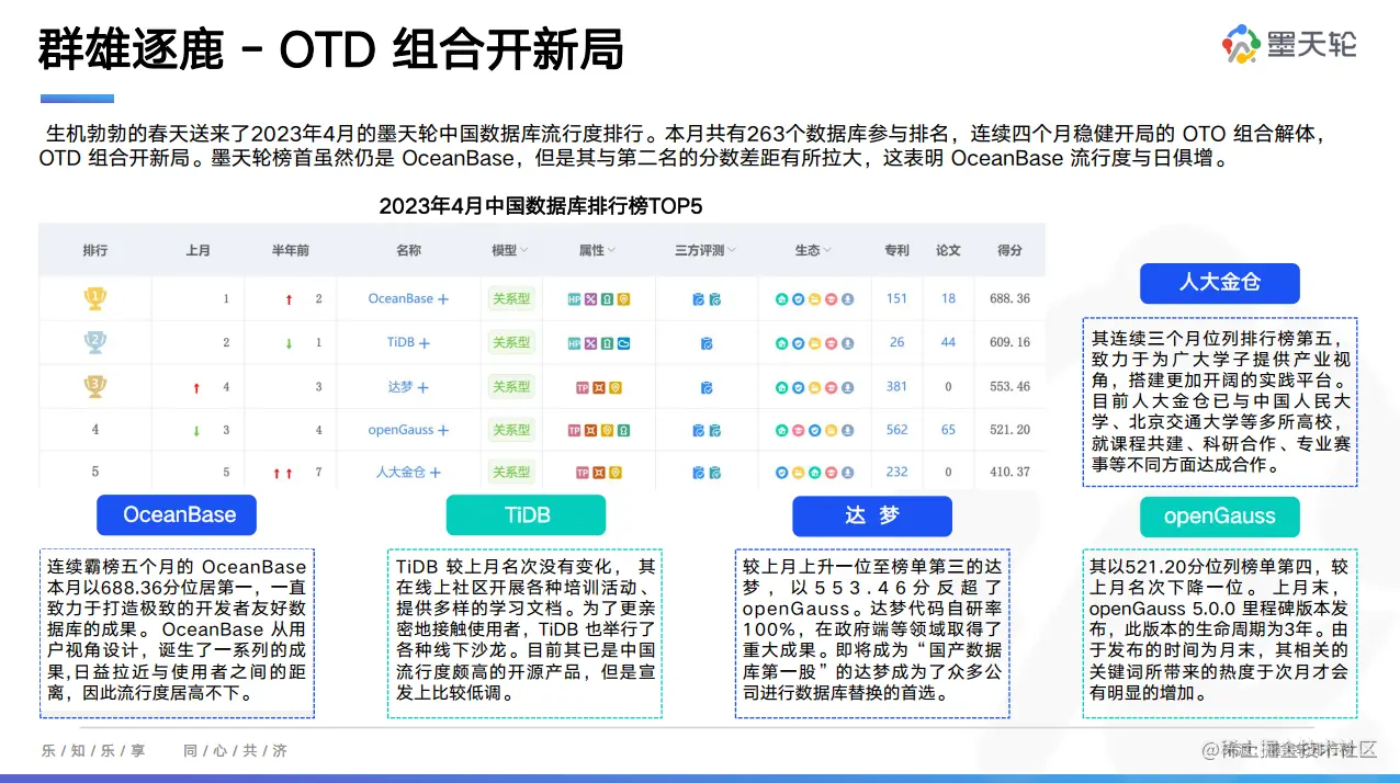 2023年4月的墨天轮中国数据库流行度排行榜共263个数据库参与排名,榜单前十用一句话可以概括为:OTO 组合解体,达梦厚积薄发夺探花;榜单第五至十名较上月未有变动。其中,榜单前三时隔4月迎来变化,OceanBase 连续五个月获得榜首,TiDB 获得榜眼,达梦以553.46分夺得探花。