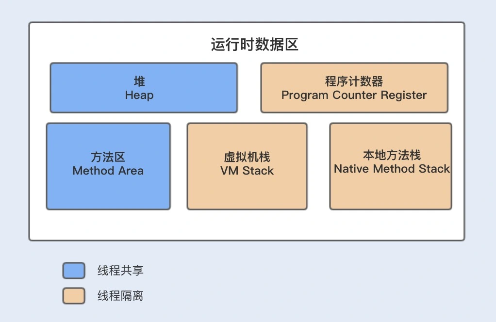 我们知道,Java 采用共享内存模型来实现多线程之间的信息交换和数据同步。在解释为什么会出现这样的结果之前,我们先通过下图来简单了解下 JVM 的内存模型,程序在运行时,局部变量将会存放在虚拟机栈中,而共享变量将会被保存在堆内存中。