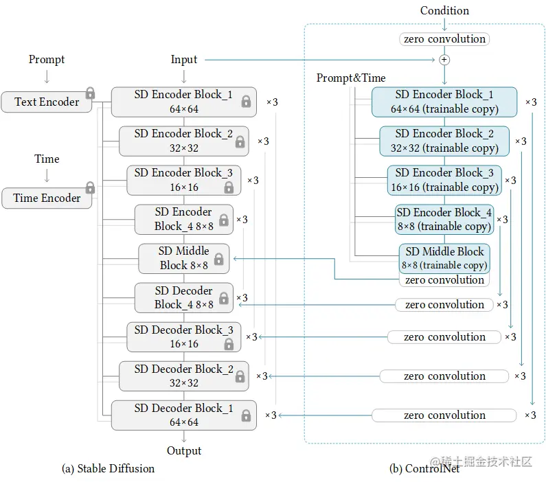 - 参数的可训练副本和锁定副本通过 "零卷积 "层连接,该层作为ControlNet框架的一部分被优化。这是一个训练技巧,在训练新的条件时,保留冻结模型已经学会的语义。