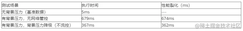 测试不同网络背景压力情况下(并行不同数量的背景压力SQL),分别测试无网络管控和背景压力降级的性能数据,记录SQL执行完成时间。