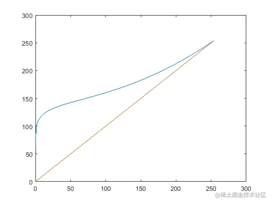 非线性gamma曲线如图下蓝线,线性映射如黄色线:
