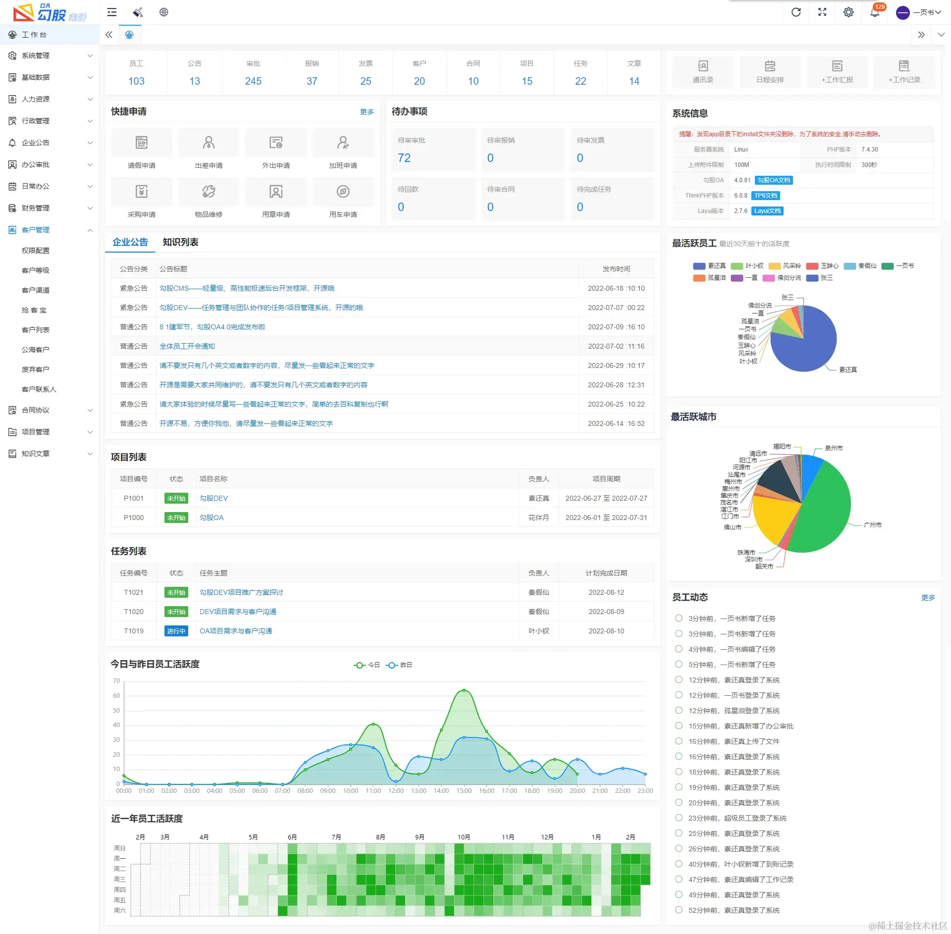 勾股 OA 办公系统是一款简单实用的开源的企业办公系统。系统集成了系统设置、人事管理、行政管理、消息管理、企业公告、知识库、审批流程设置、办公审批、日常办公、财务管理、客户管理、合同管理、项目管理、任务管理等功能模块。系统简约,易于功能扩展,方便二次开发,可以用来做日常 OA,CRM,ERP,业务管理等系统。