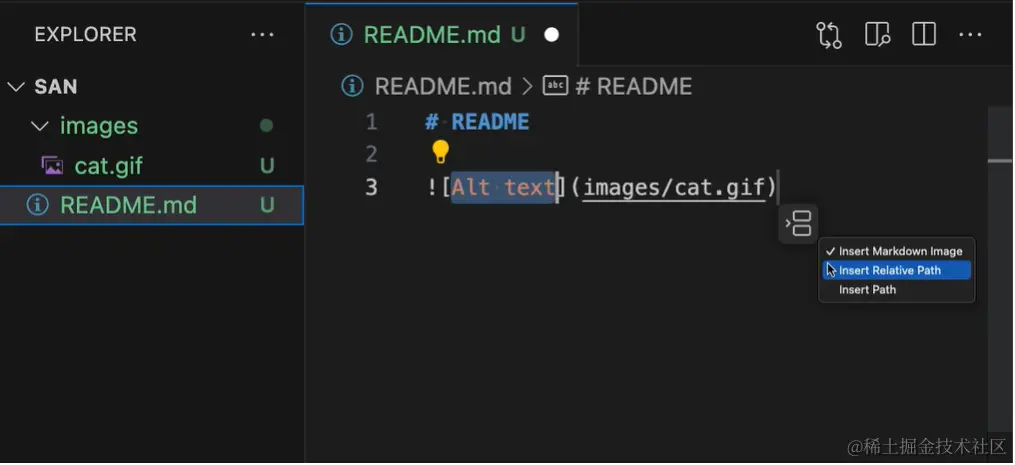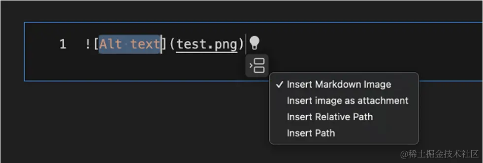 此次更新增加了 UI,可以改变将内容插入文件的方式。例如,当你把一张图片放到一个 Markdown 文件中后,这个控件可以让你在插入 Markdown 图片、图片的工作区相对路径和图片的完整路径之间切换。