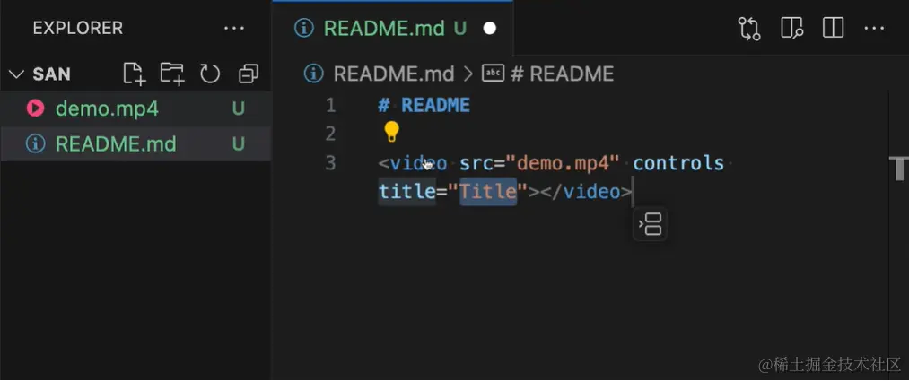 这就插入了一个指向视频文件的 tag。你可以从 VS Code 的资源管理器或你的本地操作系统中拖动视频。