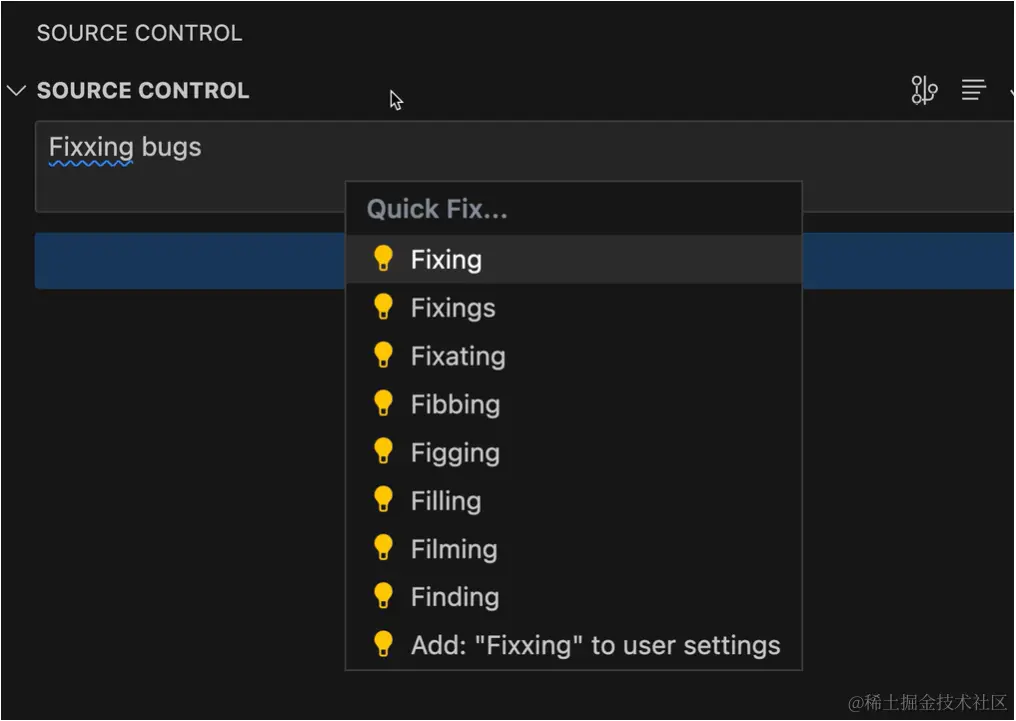 例如,Code Spell Checker 扩展为 Source Control 输入添加了拼写修复。扩展可以提供额外的修复和 Code Actions。