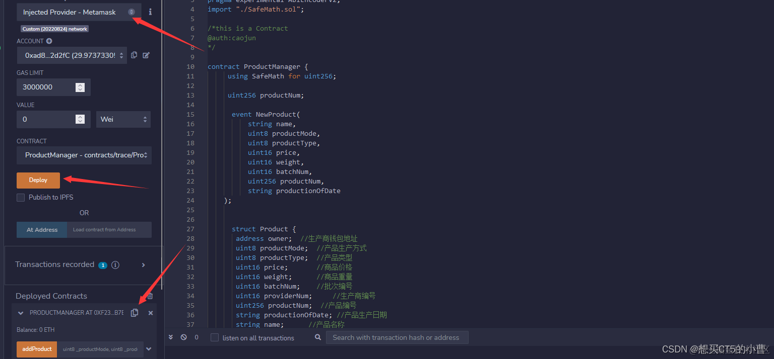 1、首先remix部署智能合约获取合约地址,如图所示: