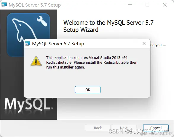 问题: 安装Mysql 5.7时候出现然后如下问题,This application requires Visual Studio 2013 x64 Redistributable.Please install the Redistributable then run this installer again.