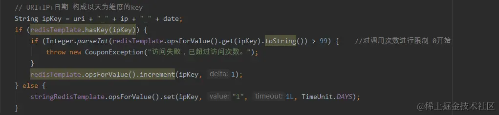 if (Integer.parseInt(redisTemplate.opsForValue().get(ipKey).toString()) > 99) { //对调用次数进行限制 0开始