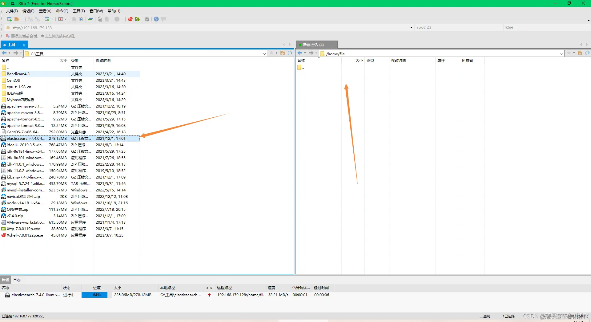 截图如下:传输成功,需要 root 登录,xftp 需要 ip 登录即可