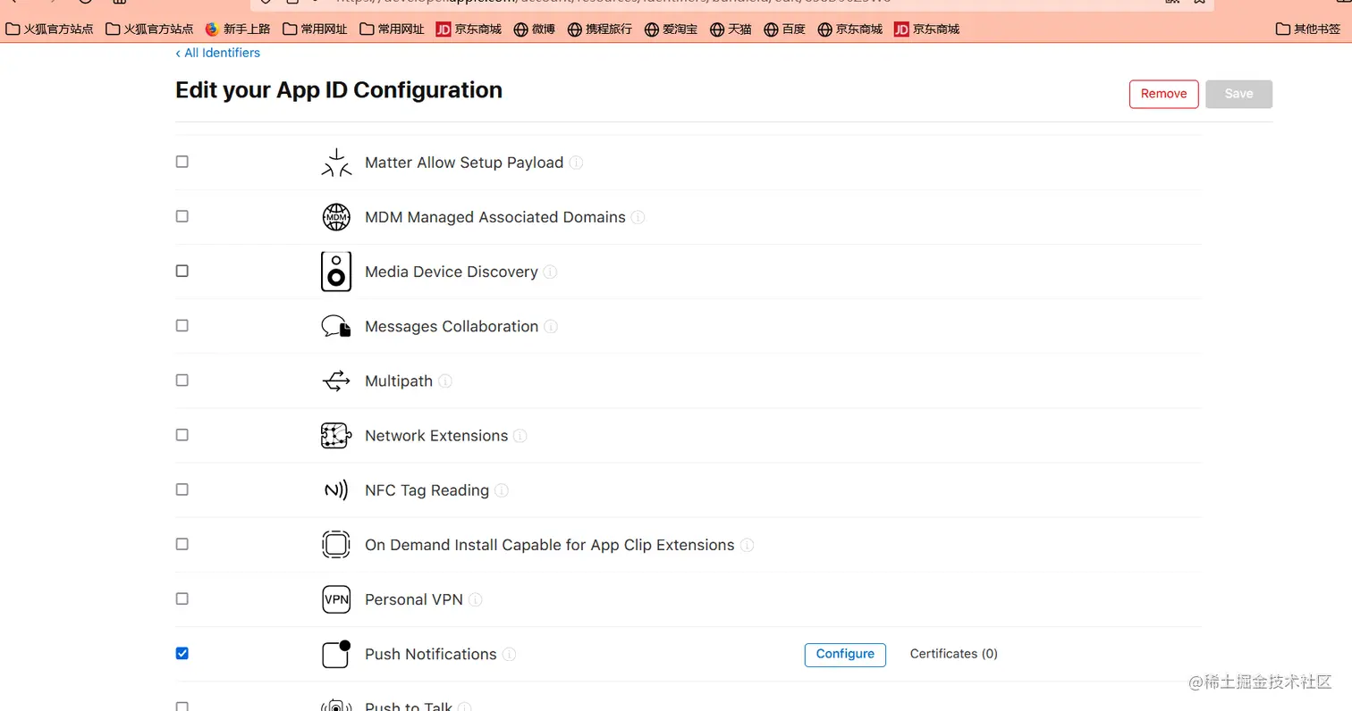 2.在左侧找到Certificats 3.找到我们要配置push功能的certificates 4.勾选push Notifications