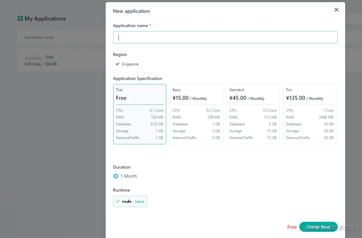 laf 为每个账号提供一个免费的实验应用可以用于快速尝试,我们直接创建免费的即可