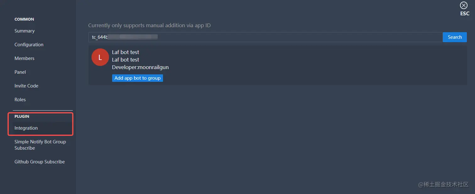 在左边找到集成功能,输入appid找到应用,点击添加机器人到群组按钮。