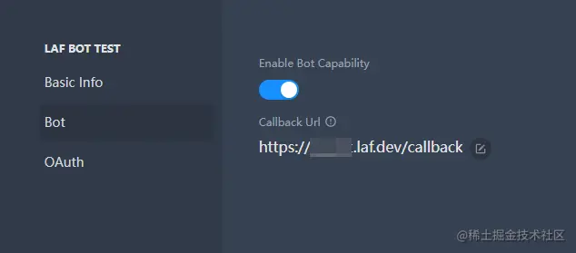 重新打开应用详情,切换到机器人标签。开启机器人功能并将我们在 laf 中拿到的 url 填入回调地址中