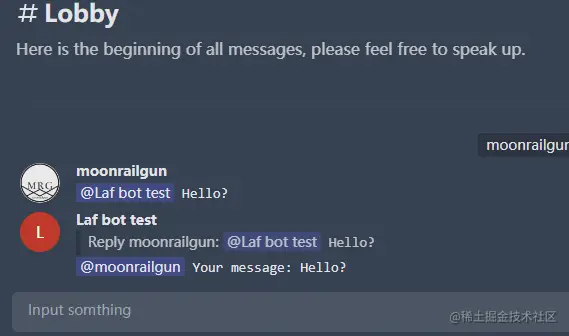 此时我们在频道中@机器人并输入内容后,就可以看到机器人进行了相应的回复