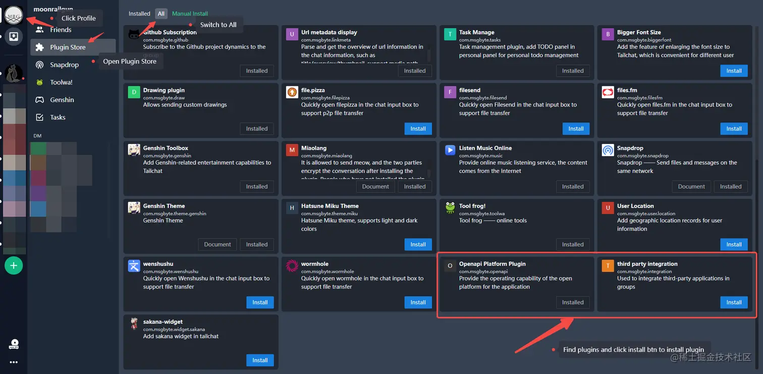 在创建前我们需要先安装相关的插件,因为Tailchat的能力都是封装在不同的插件中的,如果没有安装插件的话部分能力是不可见的。
