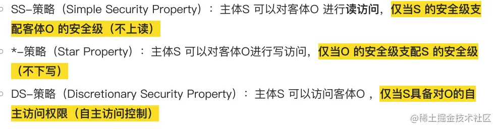*-策略对系统可⽤性的影响:高安全级的主体只能⽣产高安全级的信息;有的系统可能⽆法正常运转;