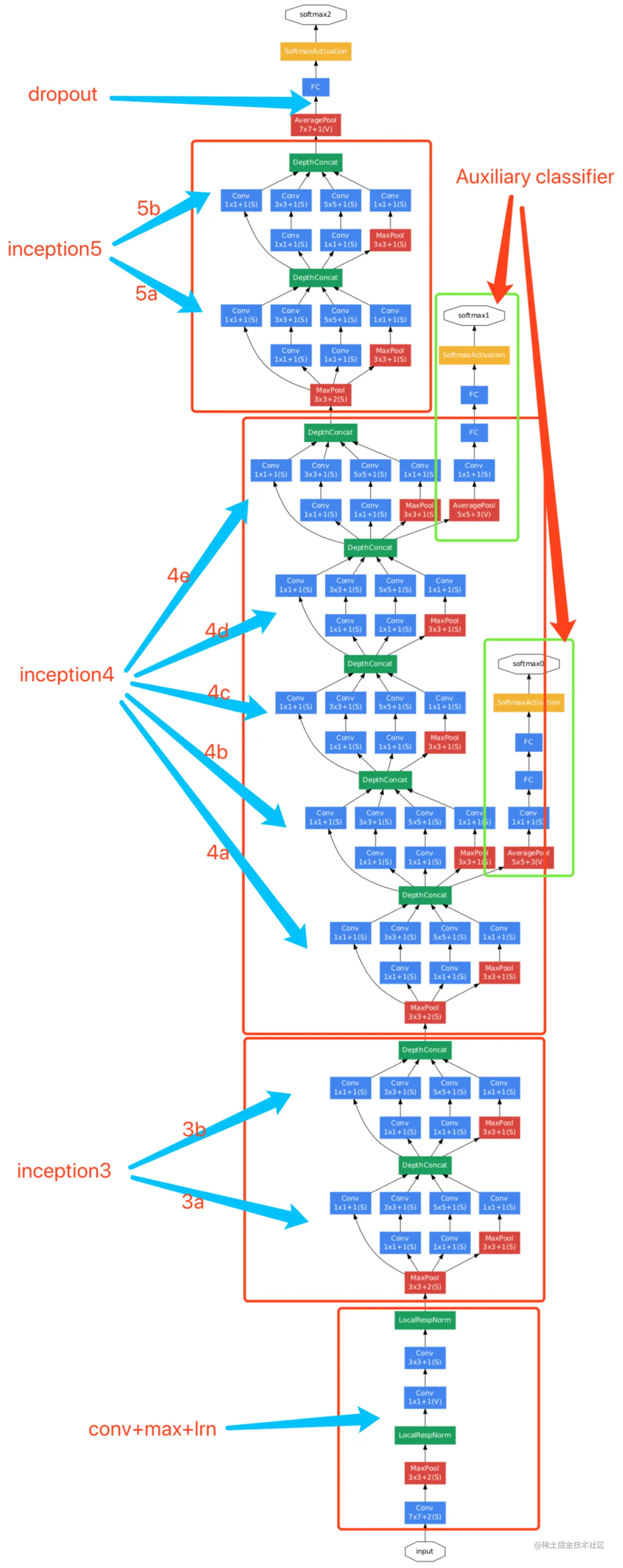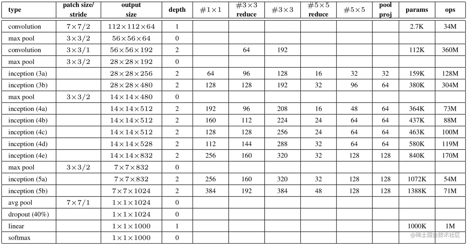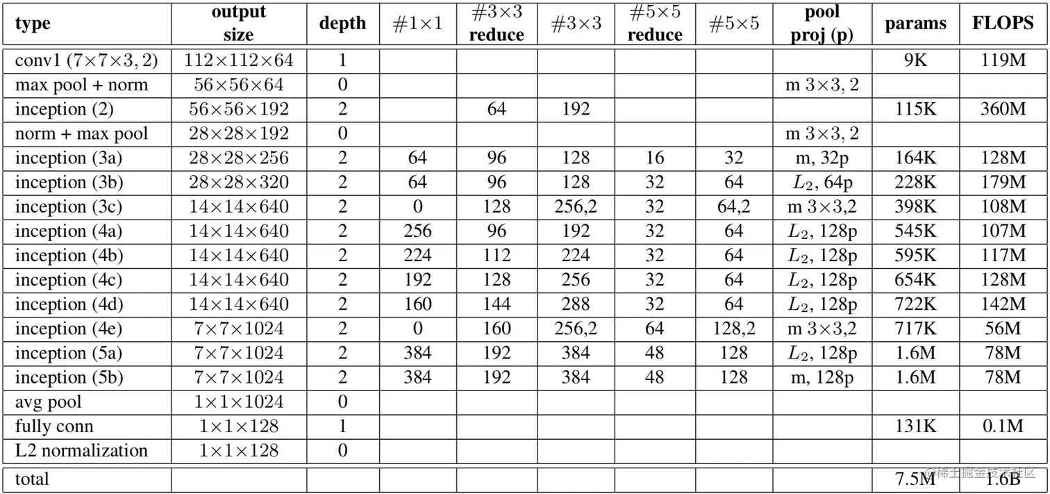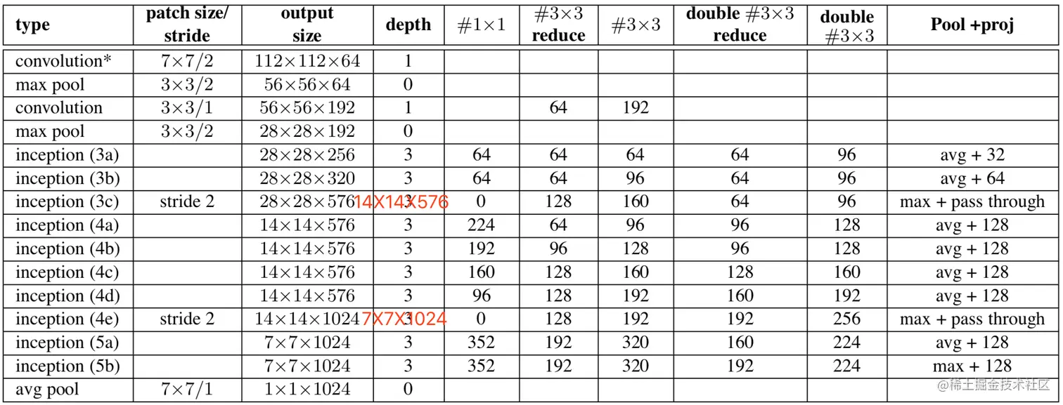 (4) 将inception(3b)后的max-pooling改为inception(3c) 模块(步长设置为2)来降低特征图分辨率,将inception(4e) 的步长设置为2以再次降低特征图分辨率,所以图中inception(3c)和(4e)的output size有点问题,应当是红色部分字体所示。