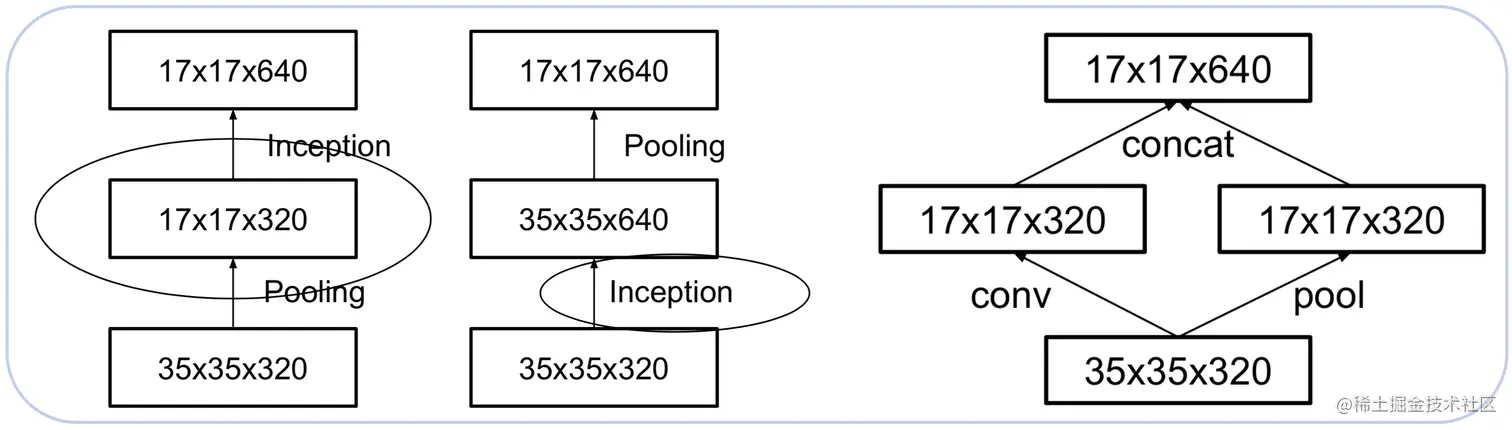 下图左侧为先Pooling再inception,右侧则相反,左侧可以显著的降低参数,但是pooling损失了空间信息,不利于后续的inception模块提取特征信息。