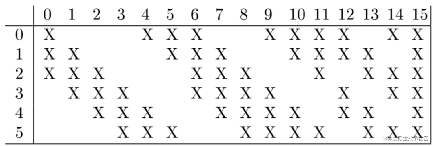 如图2-2所示,横轴为输出fm的通道(16),纵轴为输入fm的通道(6),所以输出的第0个通道对应输入的012三个通道,输出的第1个通道对应输入的123三个通道,剩下的14个通道和输入通道对应情况按照表对应即可。