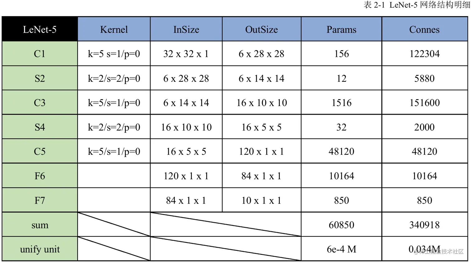 LeNet-5网络每层的具体参数设置、输入输出尺寸以及Params和Connes如表2-1所示。