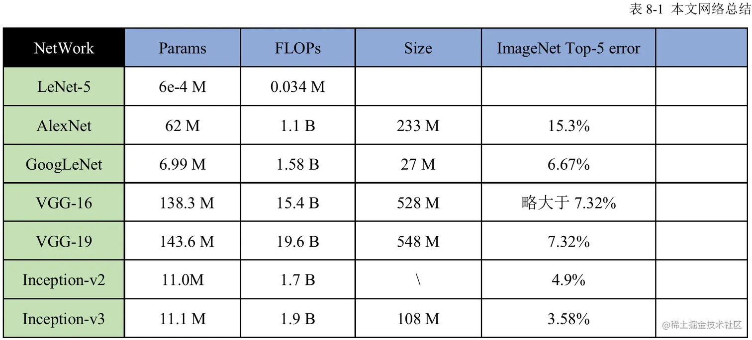 本次CNN系列之一介绍了六个主流模型,简单总结如表8-1。