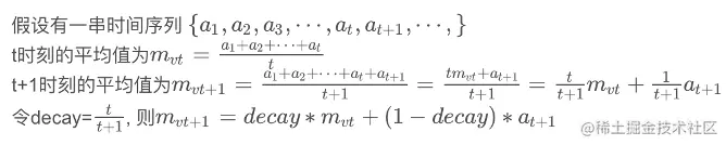 (5) 一般说来,在网络框架里,会对滑动平均法方法要求提供一个decay值,decay控制模型更新的速度,越大模型越稳定,一般设置为0.99或0.999。滑动平均法计算具体如下图。