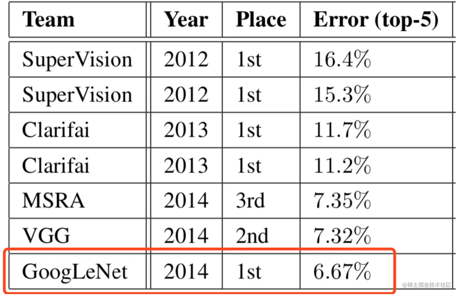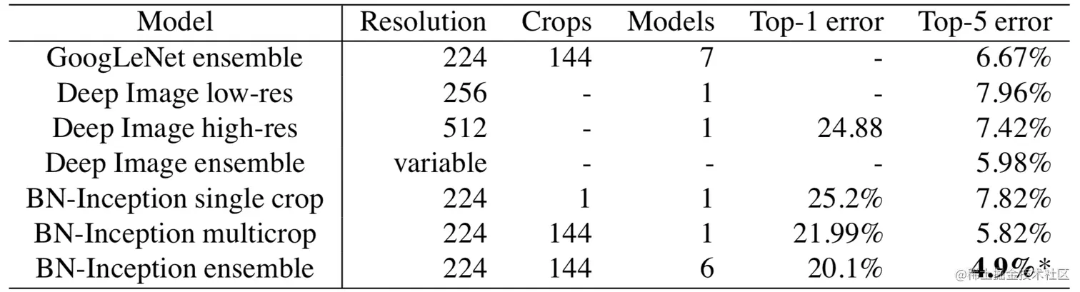 GoogLeNet在ensemble的情况下,可以将top-5 error降低到6.67% ,Inception-v2(BN-Inception)可以降低到4.9% ,提升还是非常明显的,将错误率降低到了5% 以内。而在文章《ImageNet Large Scale Visual Recognition Challenge》中提到过,人眼的错误率大概是5.1% ,这也是网络算法首次 在ImageNet上超越人类。