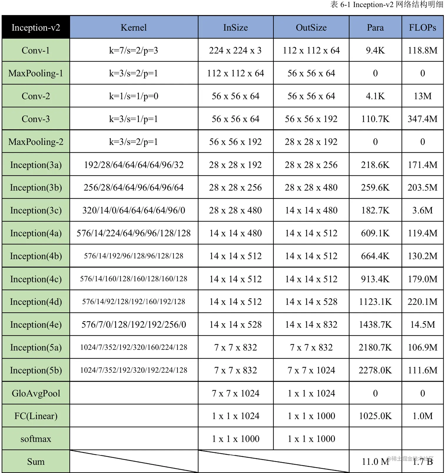 Inception-v2网络每层的具体参数设置、输入输出尺寸以及Params和Connes如表6-1所示。