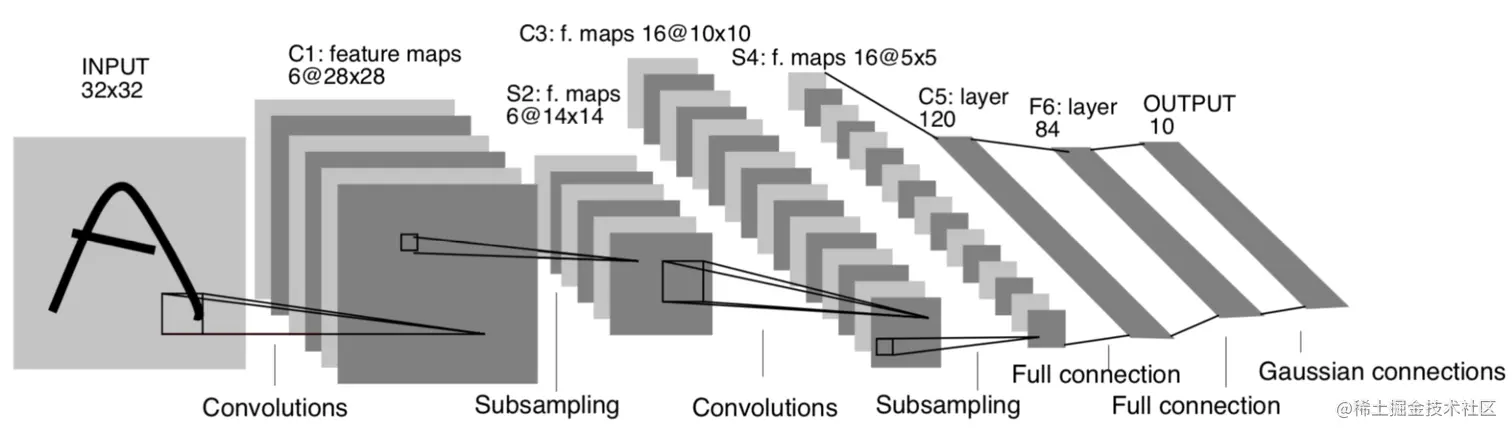 LeNet-5是1998年由深度学习的三位顶级大牛LeCun提出,是第一代比较完整的卷积神经网络,首次将反向传播梯度更新等操作用在了CNN上,并且在实际应用也就是手写字体识别上具有非常好的效果。基本构成包括基本的Conv(卷积层)、Pooling(下采样层/池化层)以及FC(全连接层),这三种基本网络层至今依然是卷积神经网络网络结构的基础层,因其当时主要用于手写数字的识别,所以也被称为手写字体识别模型,当时用的数据集就是MINIST。LeNet-5主要包括三个卷积层、两个池化层以及两个全连接层,在后来的发展实现中,可能会有一定的出入。