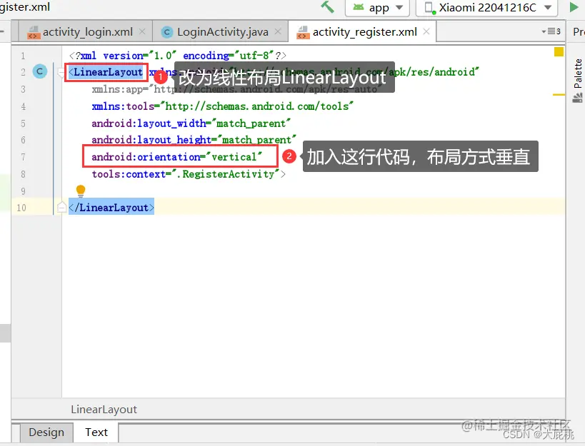 第五步、更改原始代码如下,目的是改为线性布局,且布局的排序方式为垂直