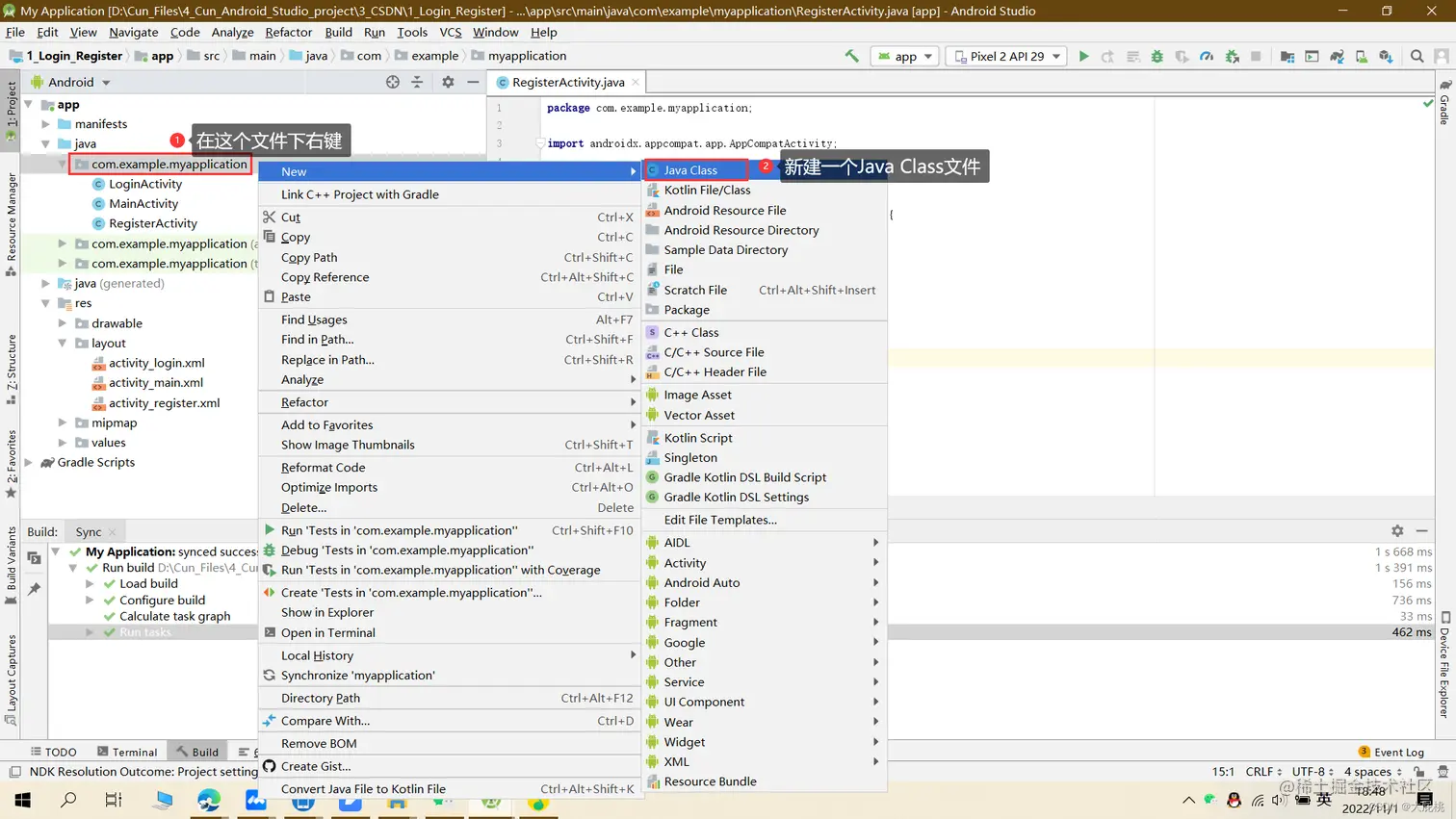 第三步、重复上述的步骤新建一个Activity,命名为RegisterActivity