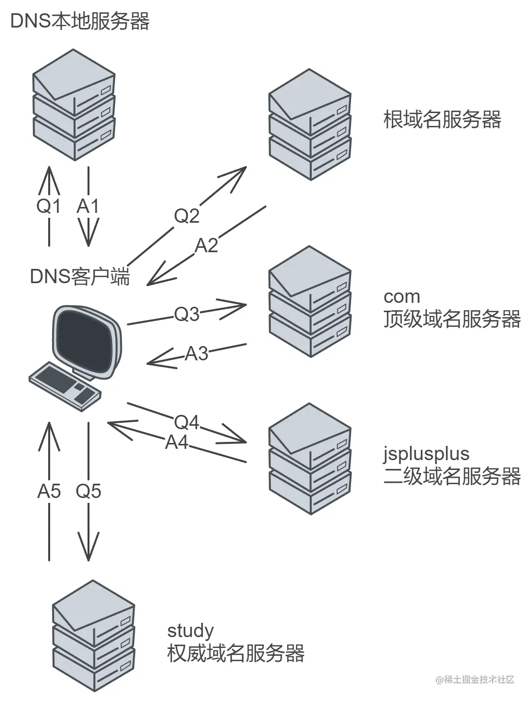 - DNS客户端重复步骤2,直到查询到对应域名的权威域名服务器返回对应的DNS记录。