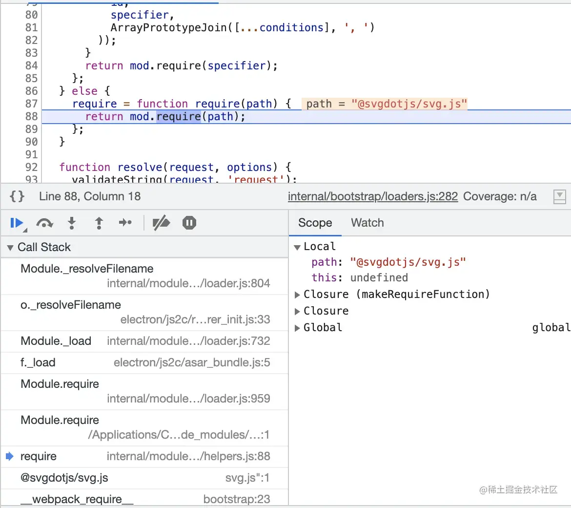 - 如果使用的是webpack打包,可以在配置中加入externals,也就是将svg.js不排除,代码直接打进bundle里面,运行的时候不会从外部require,也就避免了这个问题