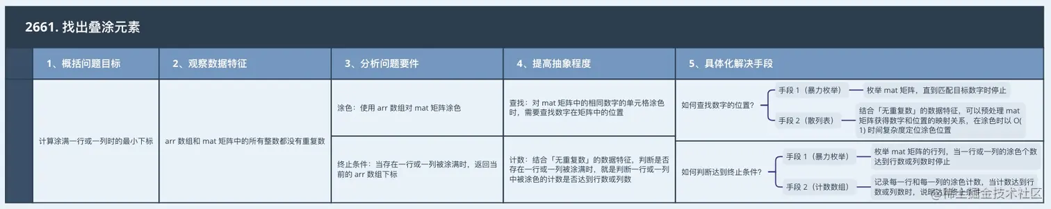 - 手段 2(散列表):结合「无重复数」的数据特征,可以预处理 mat 矩阵获得数字和位置的映射关系,在涂色时以 O(1) 时间复杂度定位涂色位置。