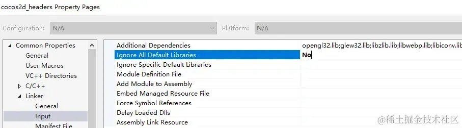 但是你会发现cocos2d_headers.props的Additional Dependencies并没有变粗: