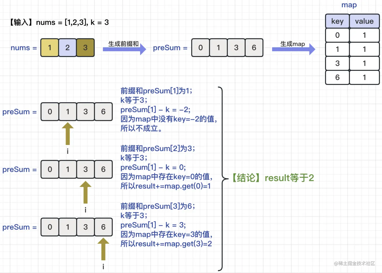 以上就是本题的解题思路了,为了便于理解,我们以输入参数nums=[1,2,3],k=3为例。看一下具体的处理过程是怎么样的,请见下图所示: