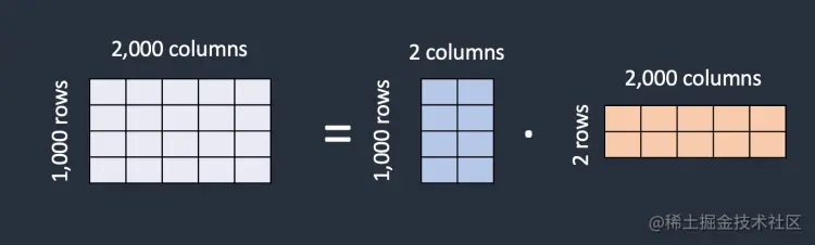 cross attention层的权重是一个矩阵,LoRA fine tune这些权重来微调模型。那么LoRA是怎么做到模型文件如此小?LoRA的做法是将一个权重矩阵分解为两个矩阵存储,能起到的作用可以用下图表示,参数量由(1000* 2000)减少到(1000* 2+2000*2), 大概300多倍!