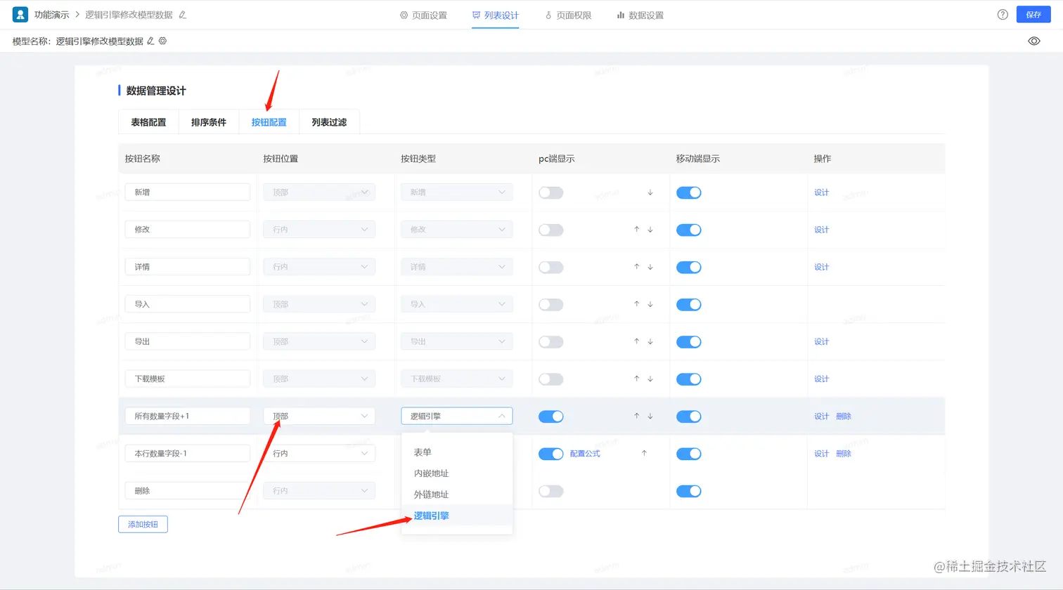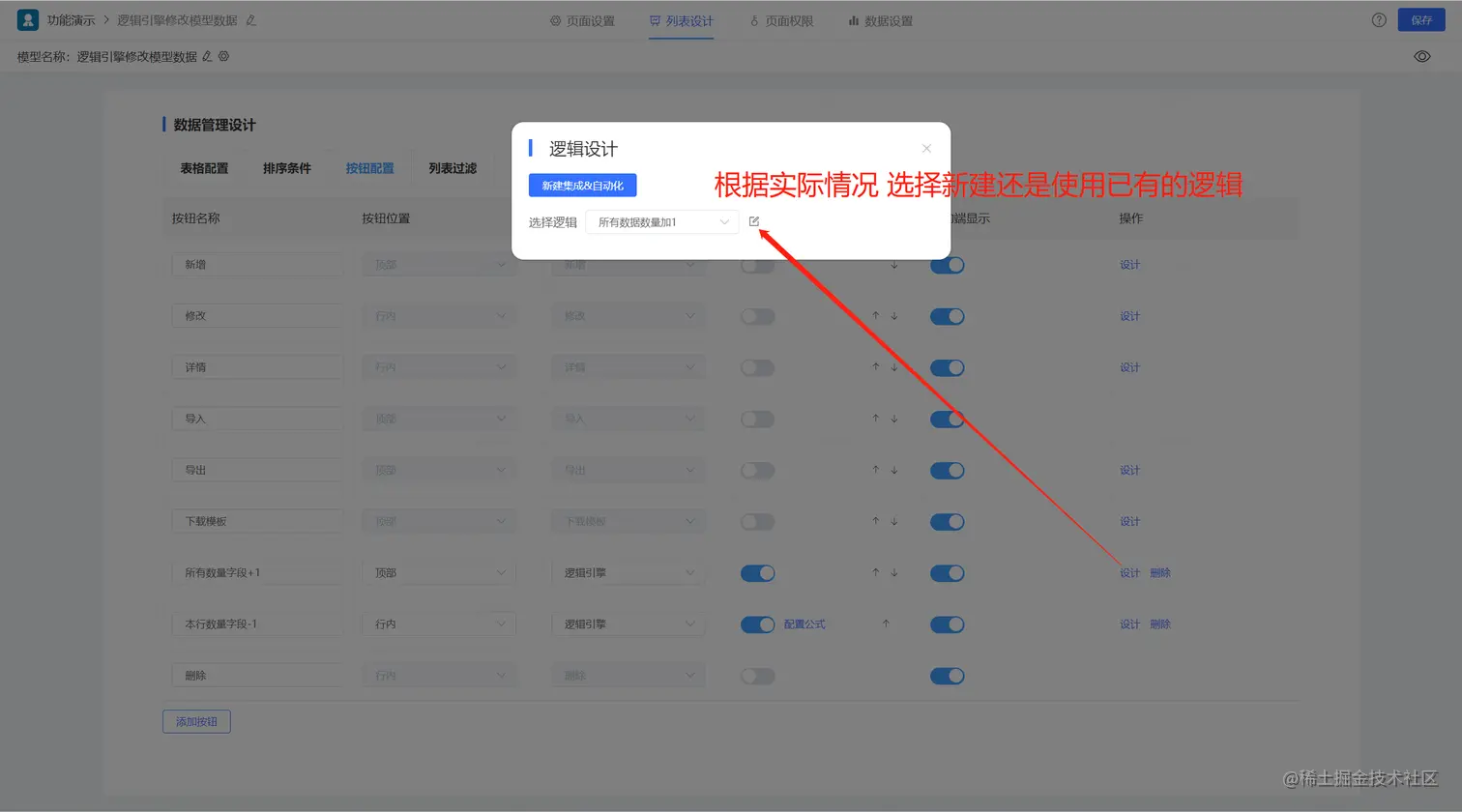 3、创建一个表级按钮,这个按钮触发一个逻辑
