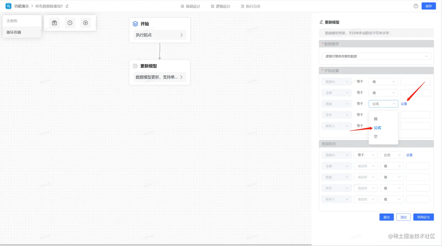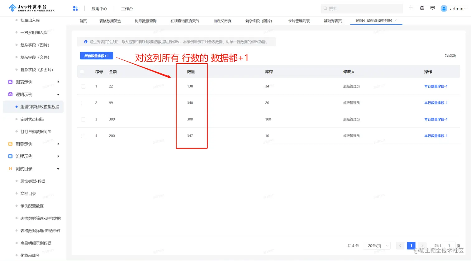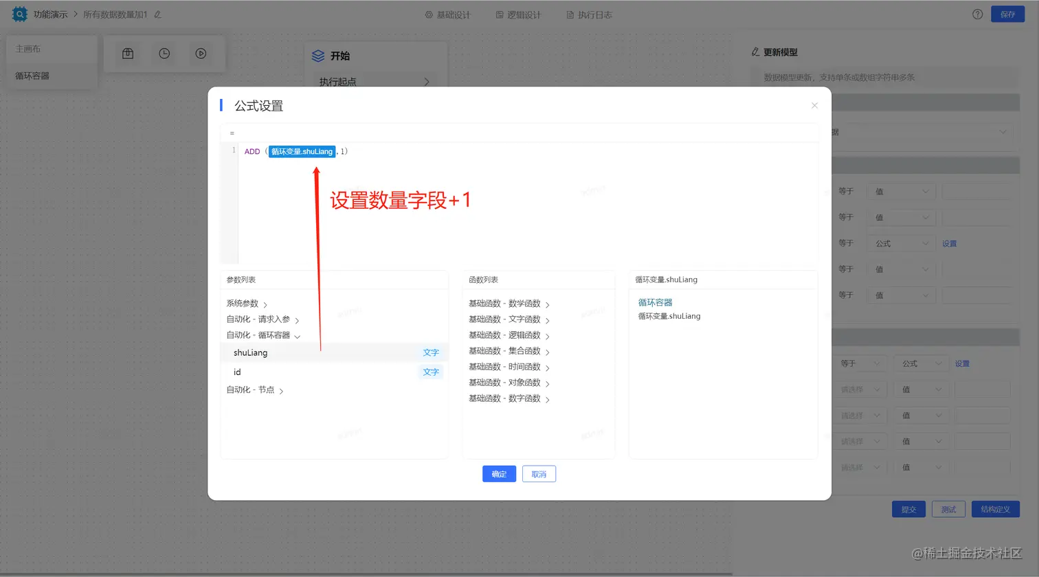 配置的思路通过这个按钮,触发一个逻辑,这个逻辑对本表的数据进行循环对每一行的数据进行处理,处理的内容就是 对“数量”字段+1 。那么我们接下来看看是如何配置实现的: