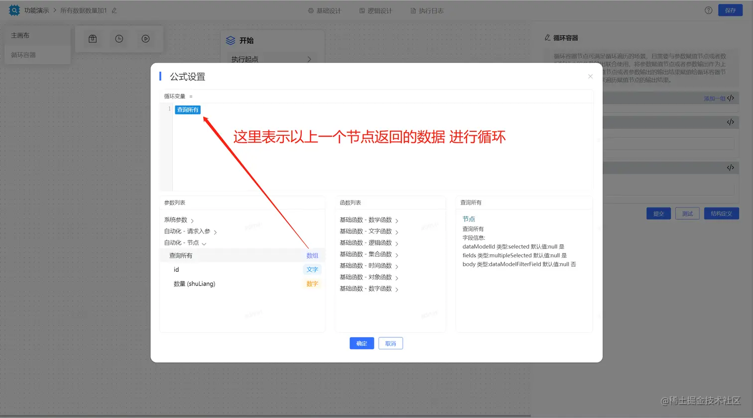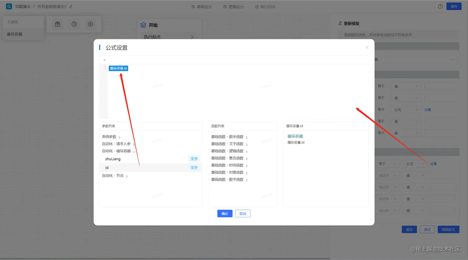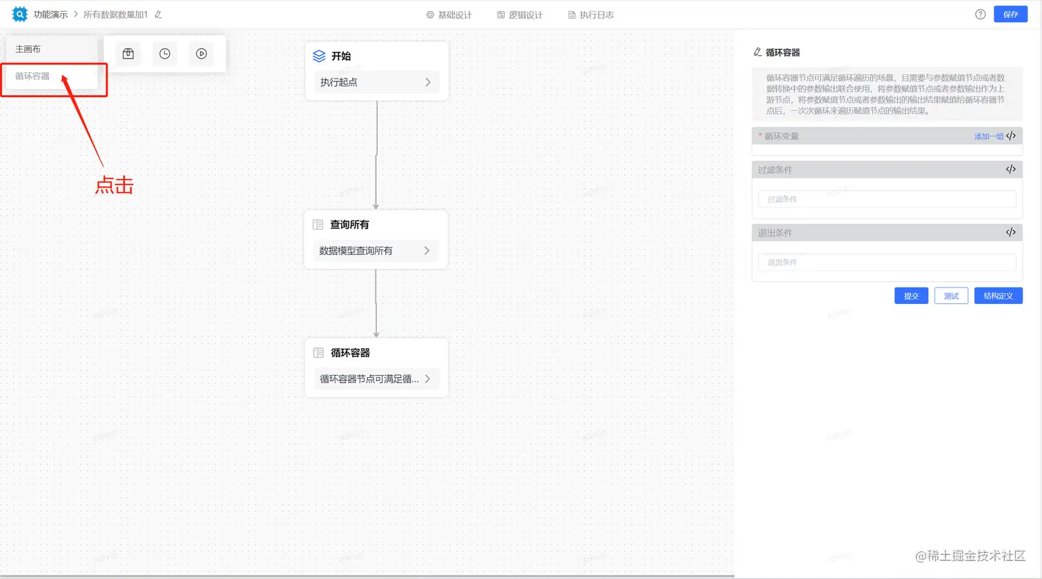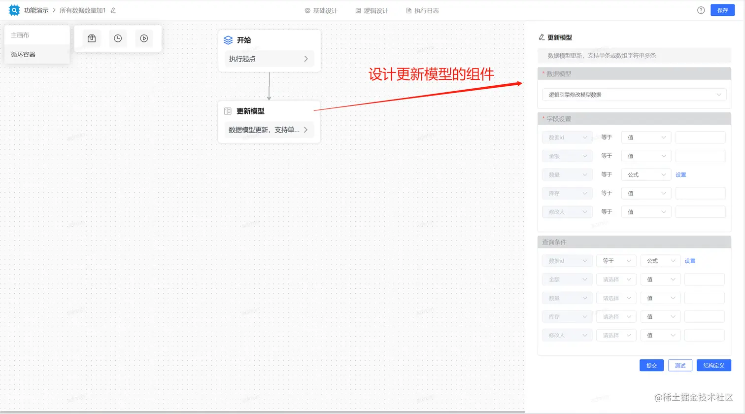 配置的思路通过这个按钮,触发一个逻辑,这个逻辑对本表的数据进行循环对每一行的数据进行处理,处理的内容就是 对“数量”字段+1 。那么我们接下来看看是如何配置实现的: