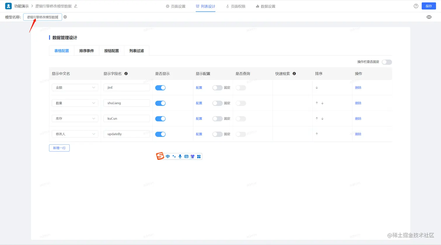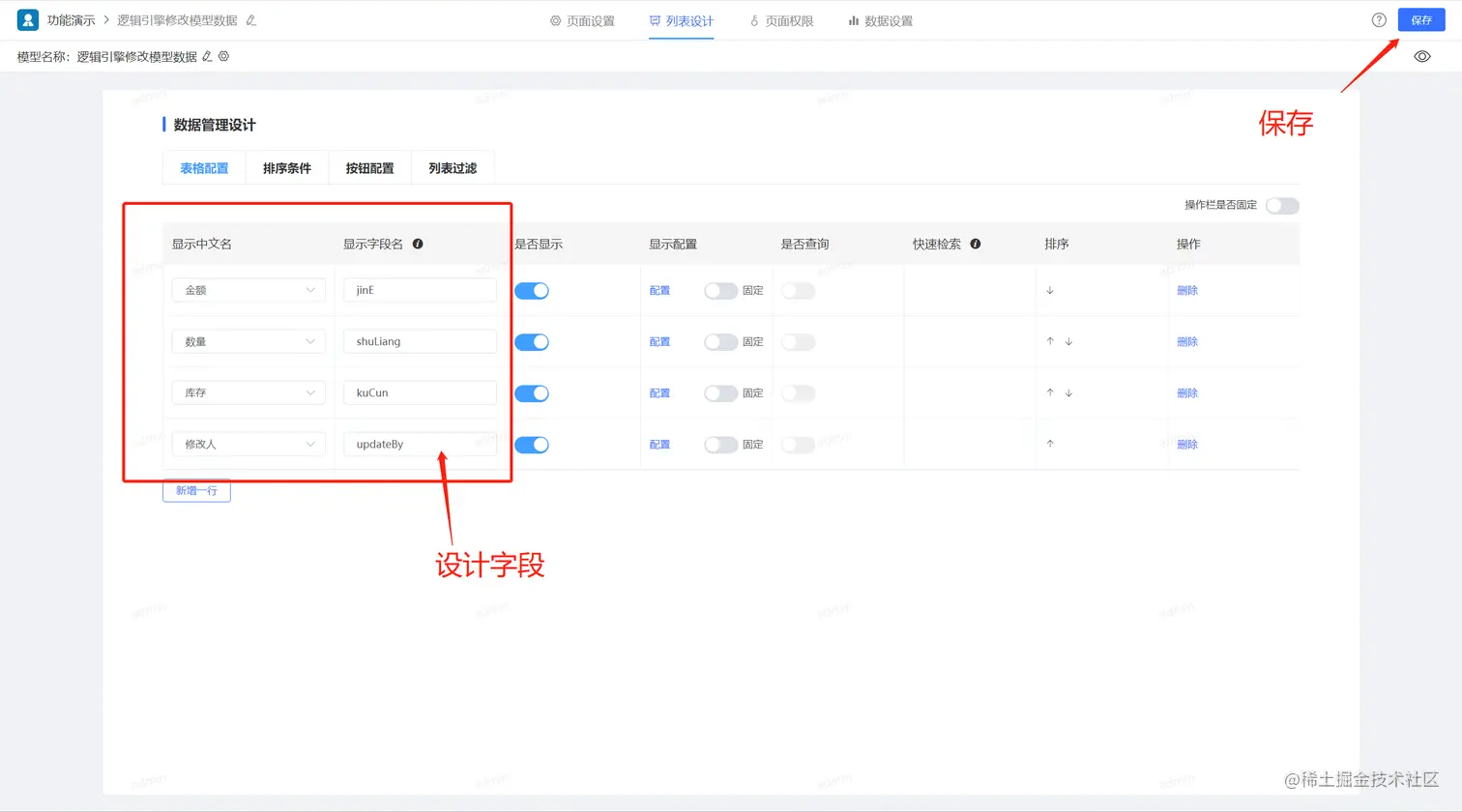 1、配置对应列表页的具体字段,点击保存,系统自动创建数据模型