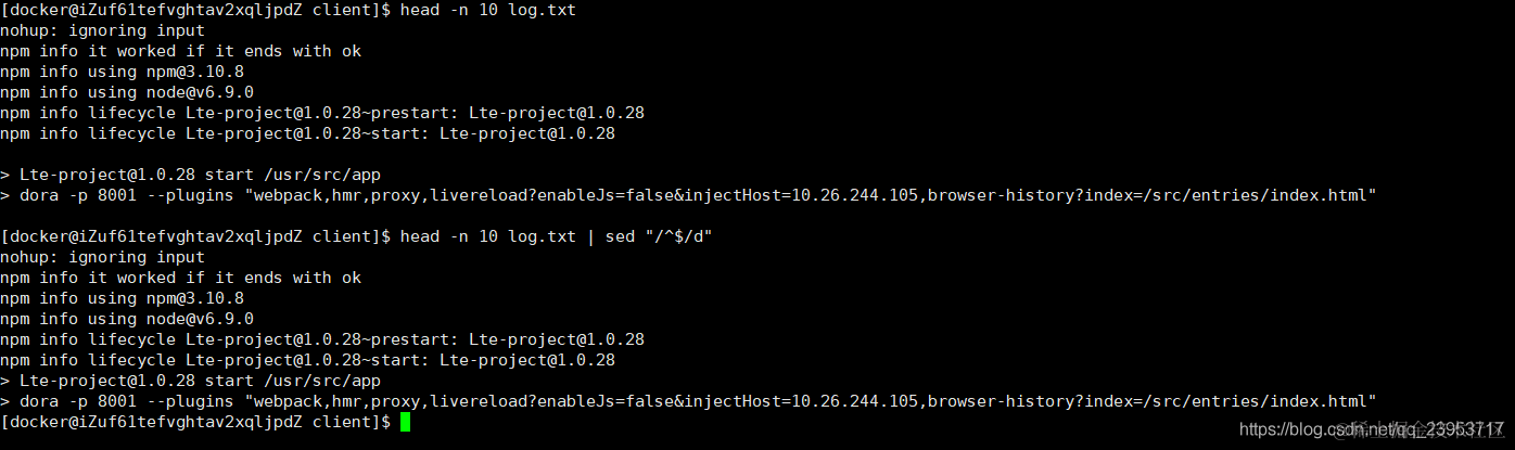 使用sed命令对文件中匹配到的行进行删除 ITIRONMAN 2023-05-06 149 阅读1分钟 1、删除空行 命令:sed "/^$/d" 如果需要对源文件进行替换,则加入-i参数即可 命令:sed -i "/^$/d" log.txt 2、删除匹配上模式的行 命令:sed -i "/pattern/d" log.txt,比如:sed -i "/npm/d" log.txt,可以删除带有npm的行