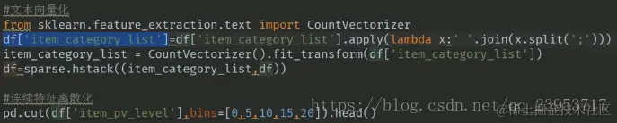 文本特征的向量化、连续特征的向量化和特征值的二值化 ITIRONMAN 2023-05-06 357 阅读1分钟 关于文本特征和连续特征,如果也需要做向量化操作,可以参照如下的方法: \ 然后,连续特征离散化后又可以进行LabelEncoder: \ 还可以对特征值进行二值化: \
