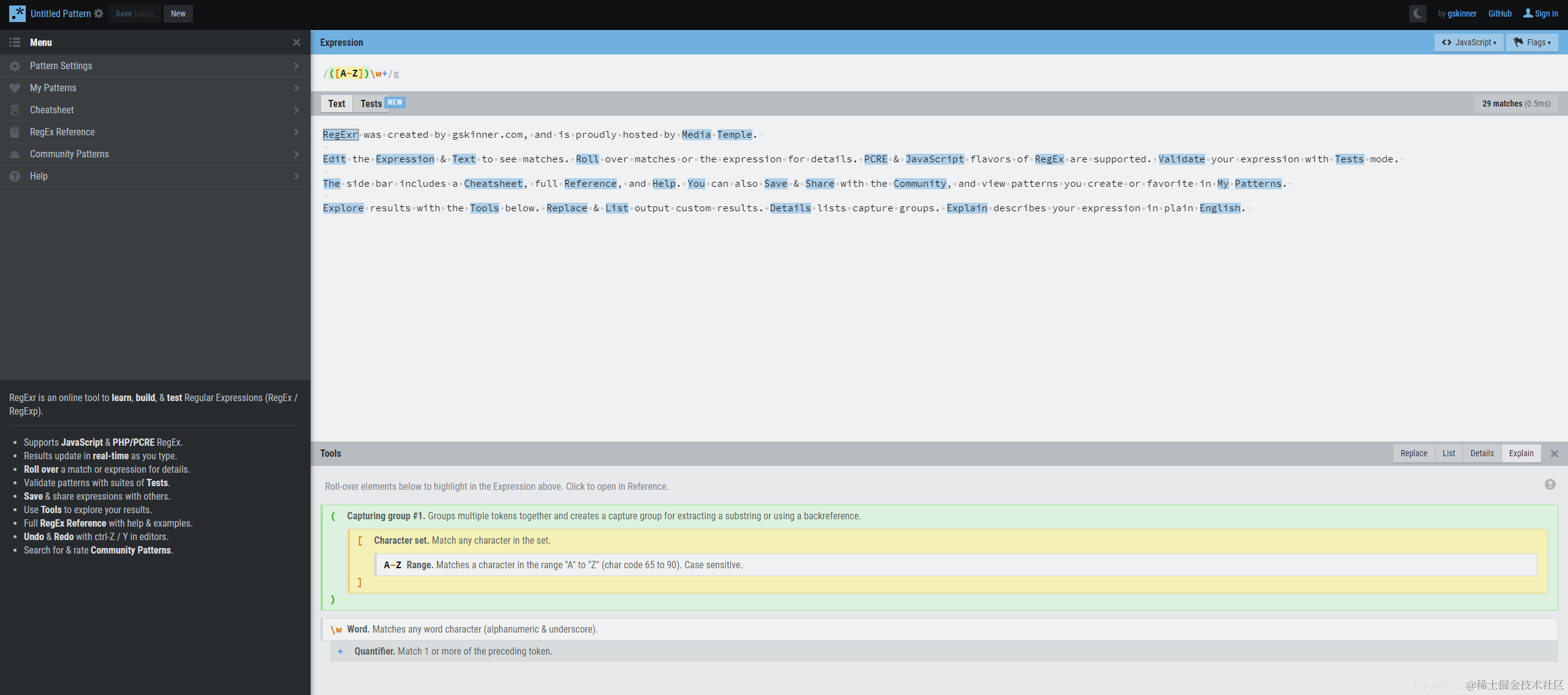 正则表达式在线测试网站推荐 ITIRONMAN 2023-05-06 243 阅读1分钟 大家经常用正则表达式,下面介绍一个超级好用的正则表达式在线测试网站: 超好用正则在线测试:regexr.com/