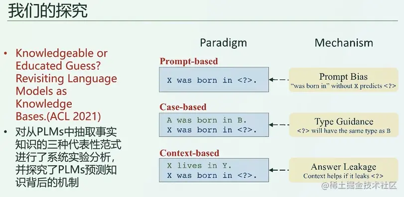 21年开始,我们开始做了一些工作,想知道模型是知识很渊博还是猜测的能力很强,它到底是否具备真正的知识。研究发现,前面所提到的预训练语言模型,如果使用这种大规模预训练模型作为知识图谱,它常常表现为三种模式。第一种是提示语的模式,我们想知道什么知识,直接问知识图谱就可以,比如x出生于哪里这个问题,只要知道x出生于后面那个答案即可,这个提示语和其答案就组成了一条关于x的出生地的一条知识。