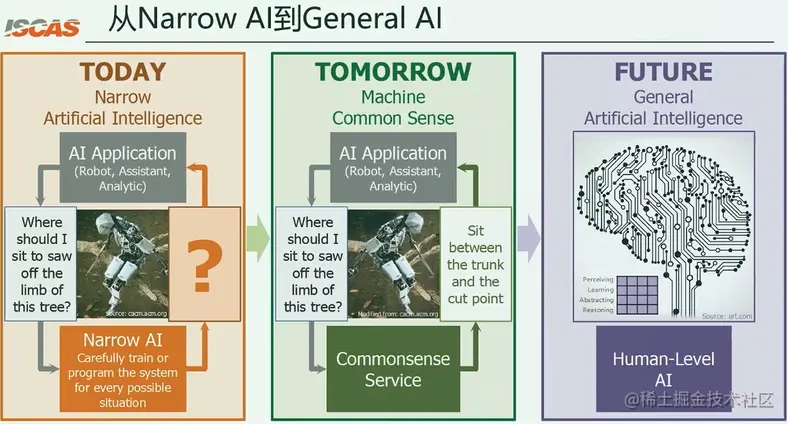 现如今AI发展迅猛,各种模型层出不穷,但是依然局限于narrow AI,也就是窄AI、弱AI的范畴。我们做每一个任务、完成每一个需求,都需要完整地构建一套新的应用来做这件事。比如说,要理解自然语言、识别图片,或者做机器人的规划,都需要从头到尾去构建一个新的AI的agent来完成。做这些任务的时候,都要去设计它的输入、输出和训练方法,构成一个agent。这样一种弱AI方式会导致:我们每次构建任务的时候都要经过繁杂的过程。是否可以考虑把这些不同的AI共同的、共享的知识提炼出来,我们并不再需要从头再去构建这些AI的能力。