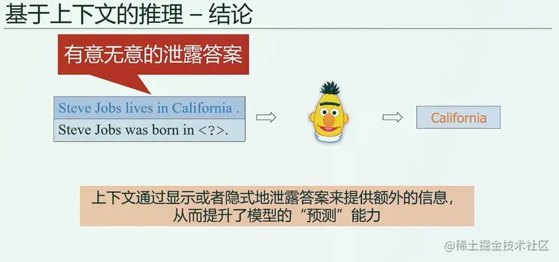这种模式就是从大规模预选领域来提取知识的能力,给出乔布斯居住在加州,创业在加州,希望提升他出生在加州的预测能力。实验证明,这些上下文的确提升了性能,但是究竟是哪些具体的上下文提升了性能呢?后来发现,因为上下文都包括了加州,所以准确率高。如果去掉加州,则准确率降低近30%,也就是这些显式的答案泄漏提升了预测能力。