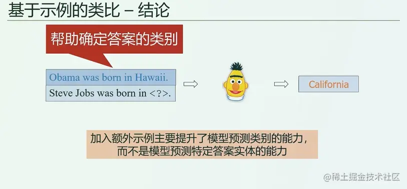 结论是:加入额外示例提升了预测类别的能力,但是并没有提升特定答案实体的能力。给出奥巴马出生在夏威夷、比尔盖茨出生在加州的例子,只是提升了模型推理出他出生在某个地方的能力,还是不能区分到底是加利福尼亚还是德克萨斯这种具体实体结果。