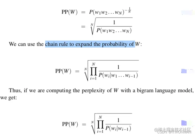 那么如何评估语言模型的好坏呢,这里引入了一个概念,叫困惑度。在实践中,我们不使用原始概率作为评估语言模型的度量,而是使用一种称为困惑度的变量。语言模型在测试集上的困惑度(有时简称PP)是测试集的逆概率,通过单词数归一化。对于测试集W = w1w2…wN。