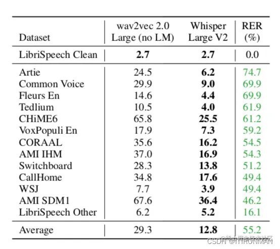 耳语模型是在广泛而多样的音频分布上进行训练的,并在零射击环境下进行评估,它可能比现有的系统更能匹配人类的行为。为了研究情况是否如此(或者机器和人类表现之间的差异是否是由于尚未被理解的因素),我们可以将Whisper模型与人类表现和标准微调机器学习模型进行比较,并检查它们更接近匹配。在我们的分析中,我们使用librisspeech作为参考数据集,因为它在现代语音识别研究中的核心作用,以及许多在其上训练的发布模型的可用性,这允许表征鲁棒性行为。我们使用另外12个学术语音识别数据集来研究分布外行为。虽然最好的zero-shot的whisper模型的librisspeech清洁测试的WER相对不显著,为2.5,这大致相当于现代监督基线或2019年中期的最先进水平,但它与监督librisspeech模型具有非常不同的鲁棒性,并且在其他数据集上表现优于所有基准的Lib- riSpeech模型,因为预训练无监督所以他和wav2vec去对比是最合适的。